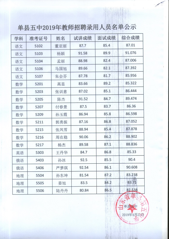 单县五中2019年教师招聘录用人员名单公示